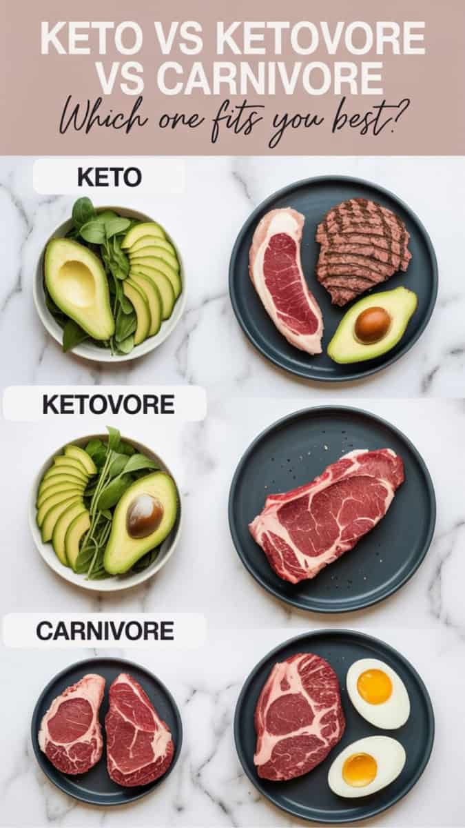 The Keto Diet emphasizes keeping your body in ketosis by eating low-carb but still allows plenty of plant foods. The Ketovore Diet leans heavily toward animal-based eating with a little flexibility for low-carb veggies or berries. And the Carnivore Diet takes it to the simplest, most nutrient-dense extreme 100% animal foods, zero carbs.