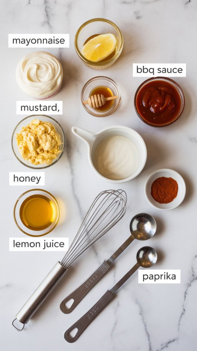 - Combine the base ingredients: Whisk together the mayonnaise, yellow mustard, and BBQ sauce in a small mixing bowl.