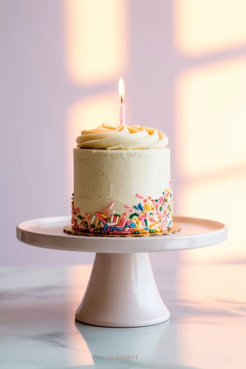 Sometimes the simplest cakes are the most joyful. This tiny vanilla celebration cake proves you don’t need a large dessert to create a moment worth celebrating. Soft vanilla sponge, creamy buttercream frosting, and a handful of colorful sprinkles turn this miniature cake into a cheerful treat perfect for birthdays, small milestones, or simply brightening an ordinary day.