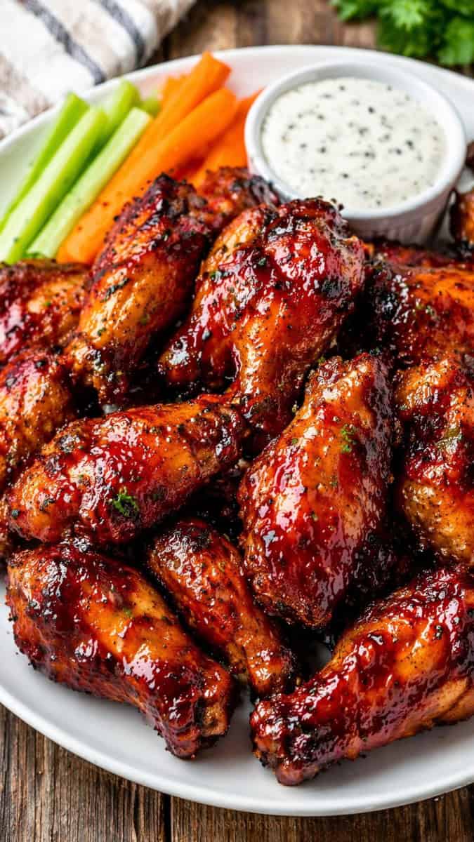 Crispy baked wings finished with a buttery BBQ glaze, giving you crunchy skin and a sticky, smoky-sweet coating without deep frying.
