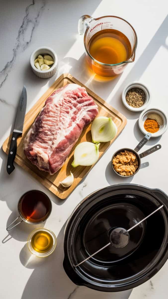 - Add liquids: Pour apple cider vinegar, water (or broth), and sprinkle brown sugar over the pork.